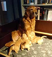 Pappa till den här kullen bor i England. Dexster är en härlig hane, mörk och rejäl, med en fantastisk attityd till arbete. Vi träffade honom sommaren 2013 när vi var i England och fick då se honom i arbete och träffa honom privat och vi blev verkligen förtjusta i honom. Han har 16 FT awards innefattande två kvalificeringar för IGL Championships 2012 och 2015. När han startade 2015 var vi på plats och följde honom under tre dagar. Han var kvar till dag 3, men föll tyvärr på målsnöret. Detta championship gick i Skottland i en terräng som är oerhört krävande och långt ifrån den terräng han är van vid, trots detta var han kvar bland de allra sista hundarna före finalen. Han har också vunnit flertalet WT och var "Top Dog på Windsor 2013". Här finns mer info om Dexster: http://reevecrew.weebly.com/echobrook-dexster.html