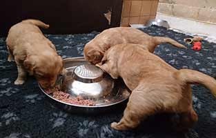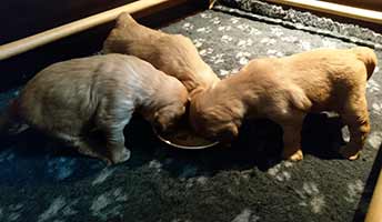 Under fjärde veckan flyttade Una och valparna till eget rum. Nu har de bättre utrymme att röra sig på. Det uppskattades av samtliga! De bor bredvid köket och tvättstugan, så vi har bra koll på dem och de på oss! Den här veckan har de också börjat äta "riktig mat", dvs köttfärs och lite hundfoder. De har varit så runda och Una har väldigt gott om mjölk så vi har dragit ut på det lite, men nu var det hög tid. Väldigt gott!