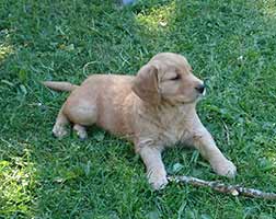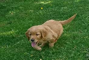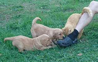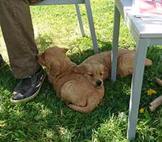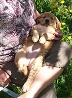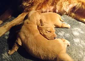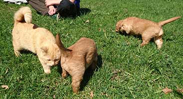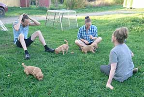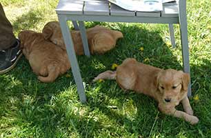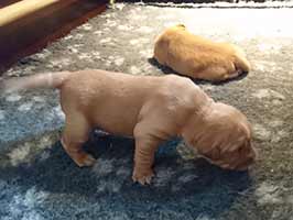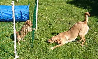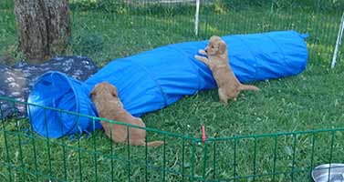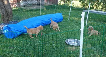 Valparna växer väldigt fort. De är ute en stor del av dagen. Vi har gjort en hage där de kan härja runt, agilitytunneln är en stor favorit i hagen! De får också hänga med på lite korta promenader runt gården. Labradoren Fly vill väldigt gärna leka med de små och gör tydliga lekinviter genom gallret. Han är dock alldeles för omogen för att få träffa valparna utan staketet som barriär.