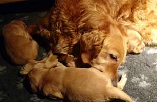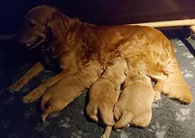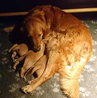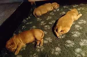 Una har väldigt gott om mat, lite väl mycket kanske med tanke på att det bara är tre valpar! Hon är mycket duktig med sina små, hon lämnar inte lådan långa stunder. De blir väl omhändertagna! Bilderna är tagna under valparnas första vecka. De har en härlig mörk färg och de ska bli så spännande att få följa dem.