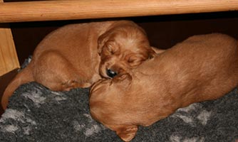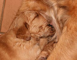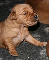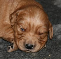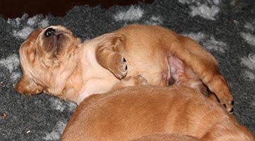 Andra veckan har passerat utan större händelser. Det är lugnt och tyst i lådan, lilleman tar in på syskonen med stormsteg. Vi har klippt klor men i övrigt låter vi "familjen" sköta sig själva. I slutet av andra veckan började ögonen öppnas och valparna började stappla omkring på alla fyra. Tissel tillbringar fortfarande mycket tid i lådan och hon vill inte vara borta längre stunder. På bilderna är valparna precis 2 veckor.