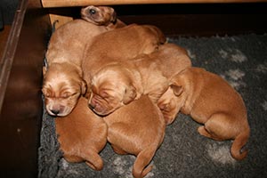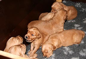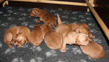 Den här veckan har det hänt saker! Mellan varven är det full rulle i lådan, ena stunden vakna och rumlar runt, andra stunden sover de djupt. De sprider ut sig mycket mer när de sover. Valparna hör nu också och märker när vi kommer. De har börjat bita på varandra och testar mellan varven sina röster. Vi har höjt framkanten så att de inte klättrar ut. Snart dags att överge lådan och flytta till större utrymme!