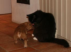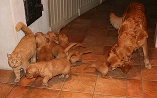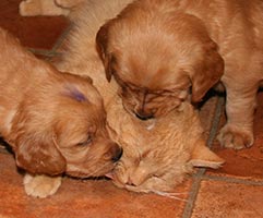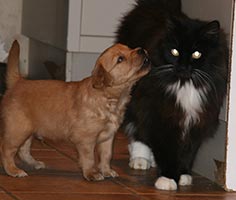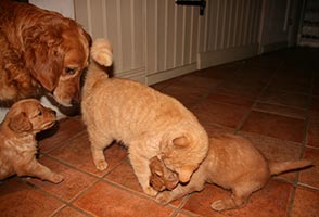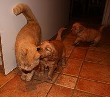 Valparna röjer runt mer och mer, det är kul att strimla tidningar och bada i vattenskålen! Det har inte varit läge att ta ut dem än, de är för små och det har varit för kallt, istället får de vara med oss i köket en del av sin vakna tid. Husets katter har börjat intressera sig för valparna. Katten "Liten" låter sig villigt tuggas på medan "Leffe" håller mer distans. Honom tuggar man inte på hur som helst! Det är intressant att se hur de samspelar och hur väl valparna läser katterna. Tissel övervakar så att allt går rätt till.