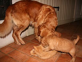 Tissel leker mycket med valparna, hon är suverän på att hålla koll på dem och styr leken på ett härligt sätt. Det är så intressant att se hur hon visar vad som är OK och vad som inte är det. De får en otroligt bra introduktion i hundvett och -etikett. Tissel delar med sig mer och mer av sin mat. Vi har till viss del låtit henne göra det, men valparna började bli väldigt runda så nu håller vi henne borta några timmar efter att hon har fått mat, annars åker allting ner i valparnas magar.