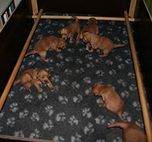 Under fjärde veckan flyttade Tissel och valparna till eget rum. Nu har de bättre utrymme att röra sig på. Det uppskattades av samtliga! De bor bredvid köket och tvättstugan, så vi har bra koll på dem och de på oss! Den här veckan har de också börjat äta "riktig mat", dvs hundfoder. De har varit så runda och Tissel har väldigt gott om mjölk så vi har dragit ut på det lite, men nu var det hög tid. Väldigt gott!